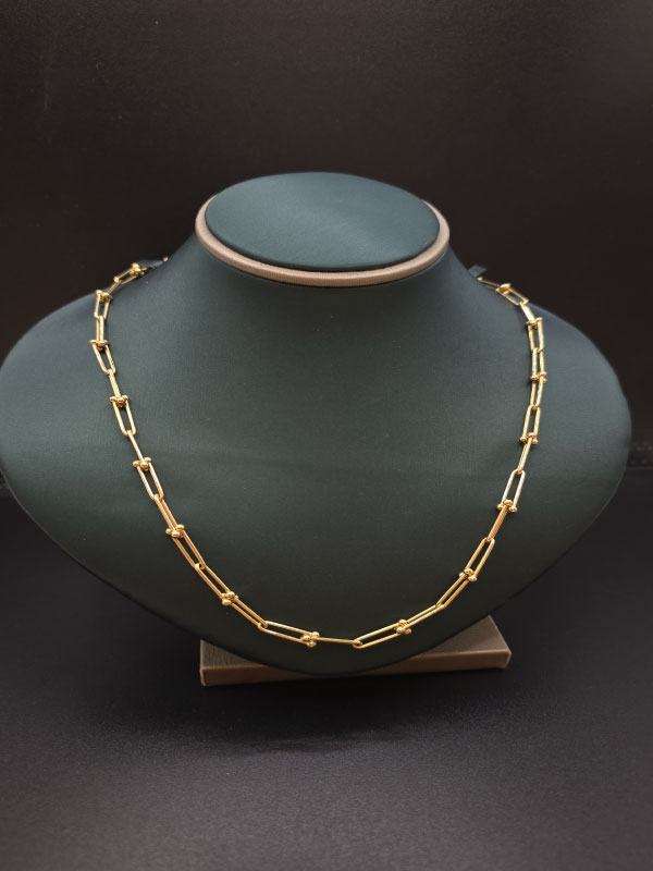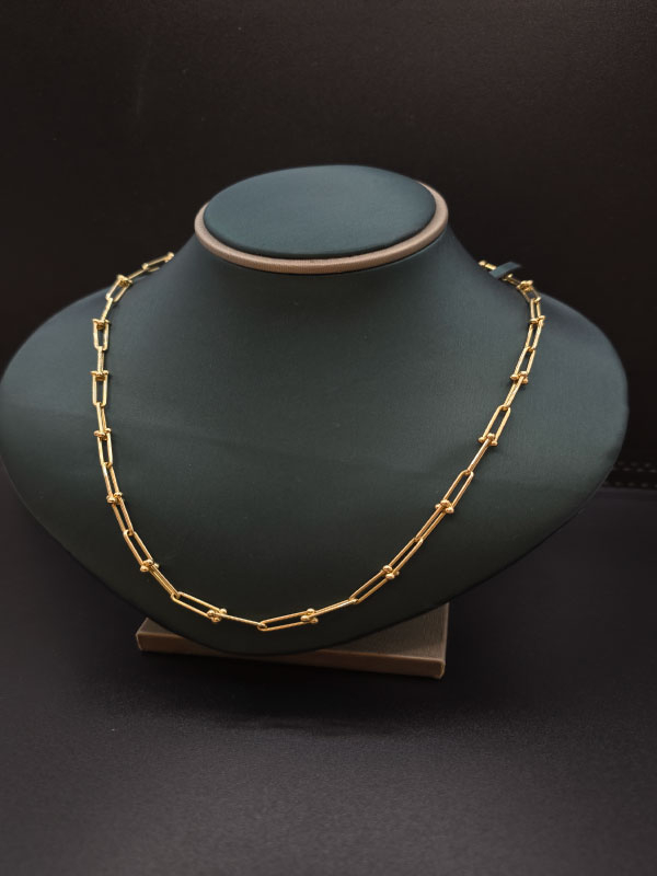 سلسال تيفاني عيار 18 هو قطعة مجوهرات أنيقة مصنوعة من الذهب عيار 18 قيراط، وتتميز بتصاميم كلاسيكية أو عصرية تتراوح من البسيطة إلى الجريئة. يتمتع بلمعان فاخر ويدوم طويلاً بسبب جودته العالية وحرفيته المتقنة، وهو مناسب للمناسبات الخاصة أو الارتداء اليومي. يأتي بأطوال وأوزان مختلفة حسب التصميم.