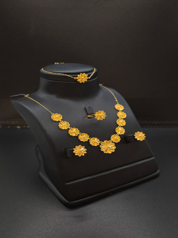 طقم النجمة عيار 21 هو مجموعة مجوهرات مصنوعة من الذهب عيار 21، ويتكون عادة من عدة قطع مثل العقد والسوار والأقراط والخاتم. يتميز بتصميم مستوحى من النجوم، وقد يضم تفاصيل زخرفية مختلفة مثل الزخارف الهندسية أو عناصر مستوحاة من الطبيعة مثل الغيوم أو النقوش التقليدية، مما يجعله لامعًا وفخمًا ومناسبًا للمناسبات الخاصة أو الارتداء اليومي.