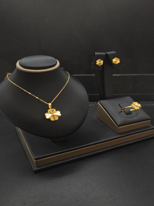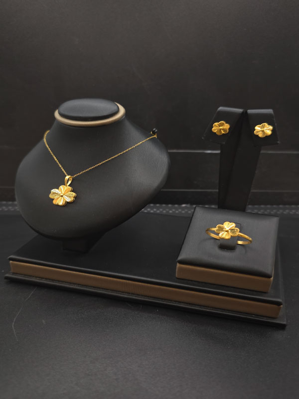 استمتعي بأروع الإطلالات مع طقم الوردة فاخر عيار 21 الذي يجمع بين الأناقة والرقي في تصميمه. مصنوع بدقة عالية من الذهب عيار 21، هذا الطقم يعكس جمالاً مثاليًا يناسب كل المناسبات.