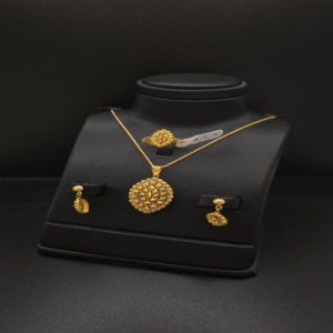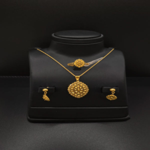 ذهب عيار 21، المعروف بجودته العالية ولمعانه الفاخر. الوزن: 8.45 جرام، مما يضمن طقمًا فاخرًا ومثاليًا للمناسبات الخاصة. اللون: ذهب أصفر لامع، يضفي لمسة من الفخامة على إطلالتكِ. مكونات الطقم: يتكون الطقم من عقد، سوار، خاتم، وأقراط، مما يضمن لكِ إطلالة متكاملة.