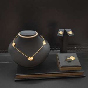 يتميز هذا الطقم بتصميم راقٍ ودقيق يتكامل تمامًا مع الذهب عيار 21 الخالص. إنه الخيار المثالي لأي امرأة تبحث عن الإطلالة المثالية.