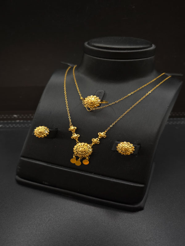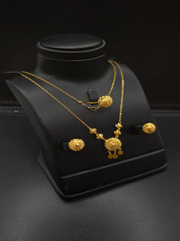 يتم تصنيع هذا الطقم باستخدام أفضل معايير الدقة والحرفية لضمان المتانة والتألق الطويل الأمد. بفضل نقاء الذهب عيار 21، يضفي الطقم لمسة استثنائية على إطلالتك ويتميز بسهولة التناسق مع مختلف أنواع الأزياء.