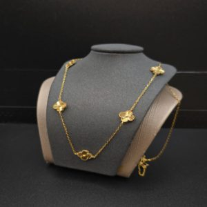 عقد فان كليف عيار 21 هو عقد ذهبي يجمع بين أناقة تصميم فان كليف الشهير (غالبًا مستوحى من زهرة الأقحوان أو الوردة الرباعية) والعيار الذهبي المرتفع عيار 21، الذي يوفر بريقًا ولمعانًا جذابين مع متانة مناسبة للارتداء اليومي والمناسبات. غالبًا ما يأتي بتصميمات متنوعة تتضمن تعليقات ناعمة بأشكال الزهور، وهو ما يمنح العقد لمسة أنثوية راقية.