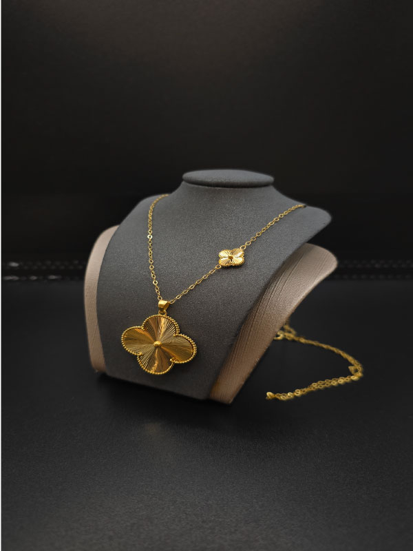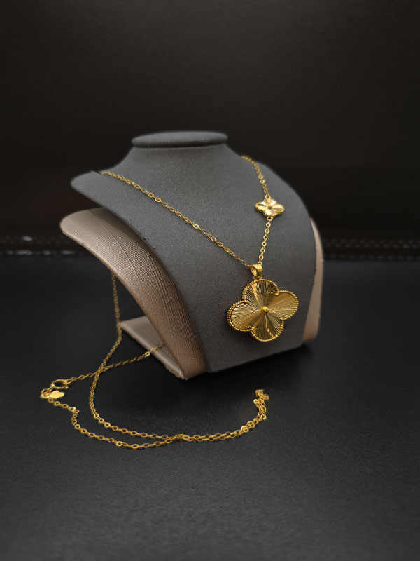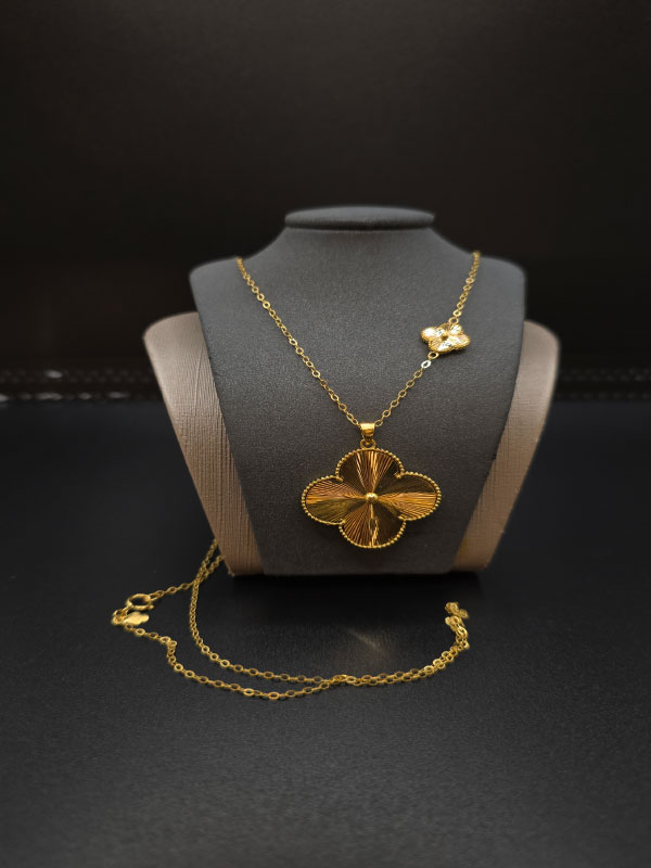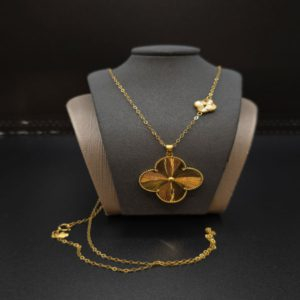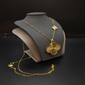 عقد فان كليف عيار 21 هو قطعة مجوهرات ذهبية فاخرة مستوحاة من التصميم الأيقوني لدار Van Cleef & Arpels، يتميز بتصميم الزهرة رباعية الأوراق المصنوعة من الذهب عيار 21 قيراط. تختلف مواصفاته حسب التصميم، لكنه يشمل خيارات بتصاميم متنوعة كوردة واحدة أو خمس وردات، بأوزان وأطوال مختلفة تناسب مختلف المناسبات وتُبرز الأناقة والرقي.