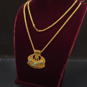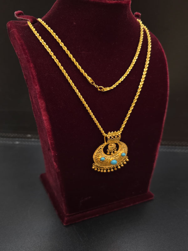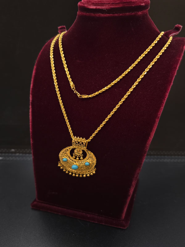 هذا العقد يتميز بجودة الذهب العالية ودقة التفاصيل، مما يجعله قطعة فريدة تلائم كل مناسباتك الفاخرة.